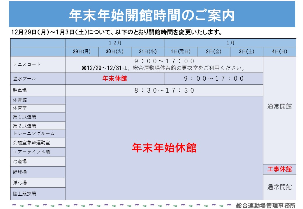 総合運動場 施設利用(年末年始)のご案内(12月29日~1月3日)