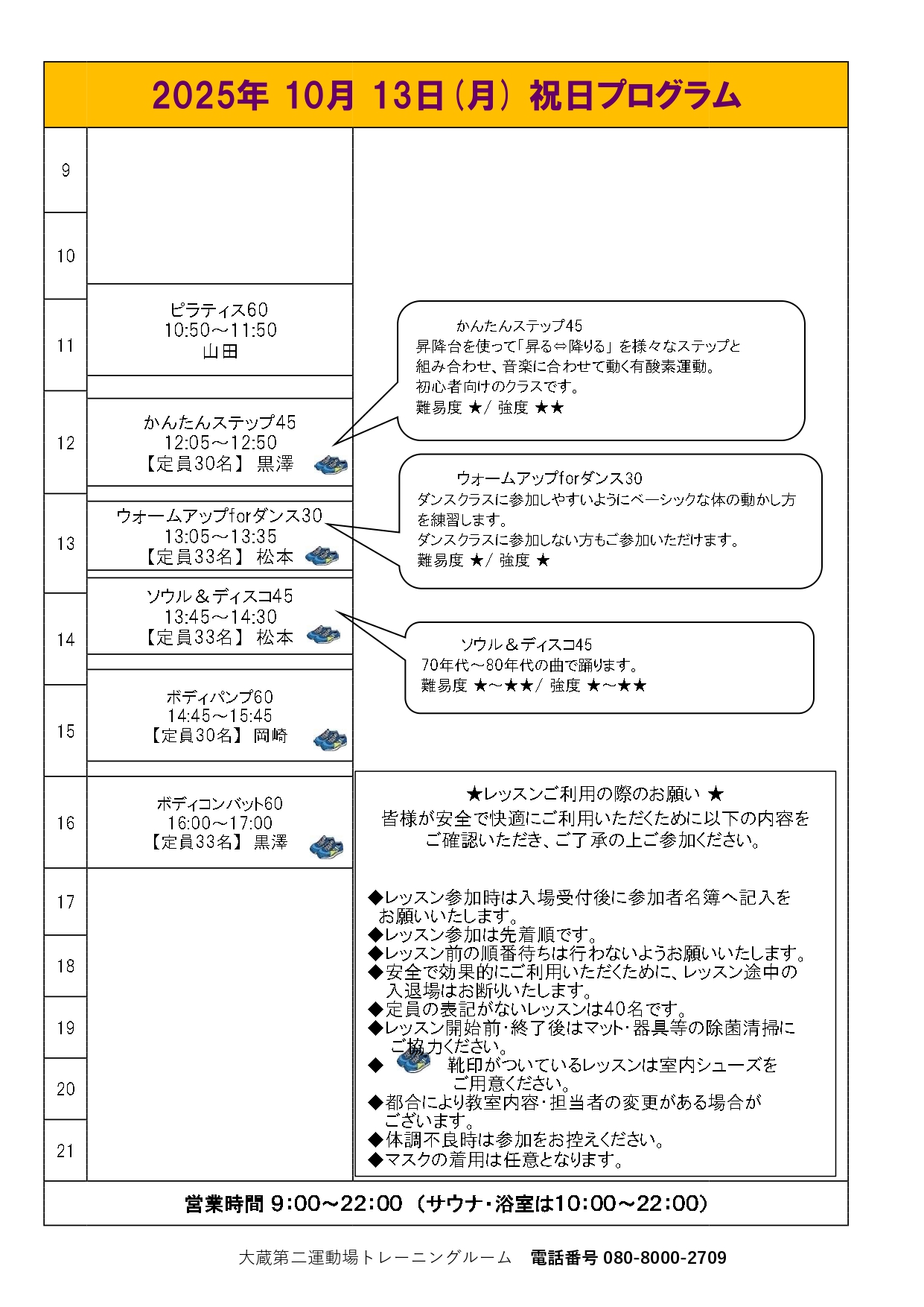 10月13日(月・祝)は祝日プログラムを開催致します。当日は通常プログラムとは異なりますので、予めご了承ください。