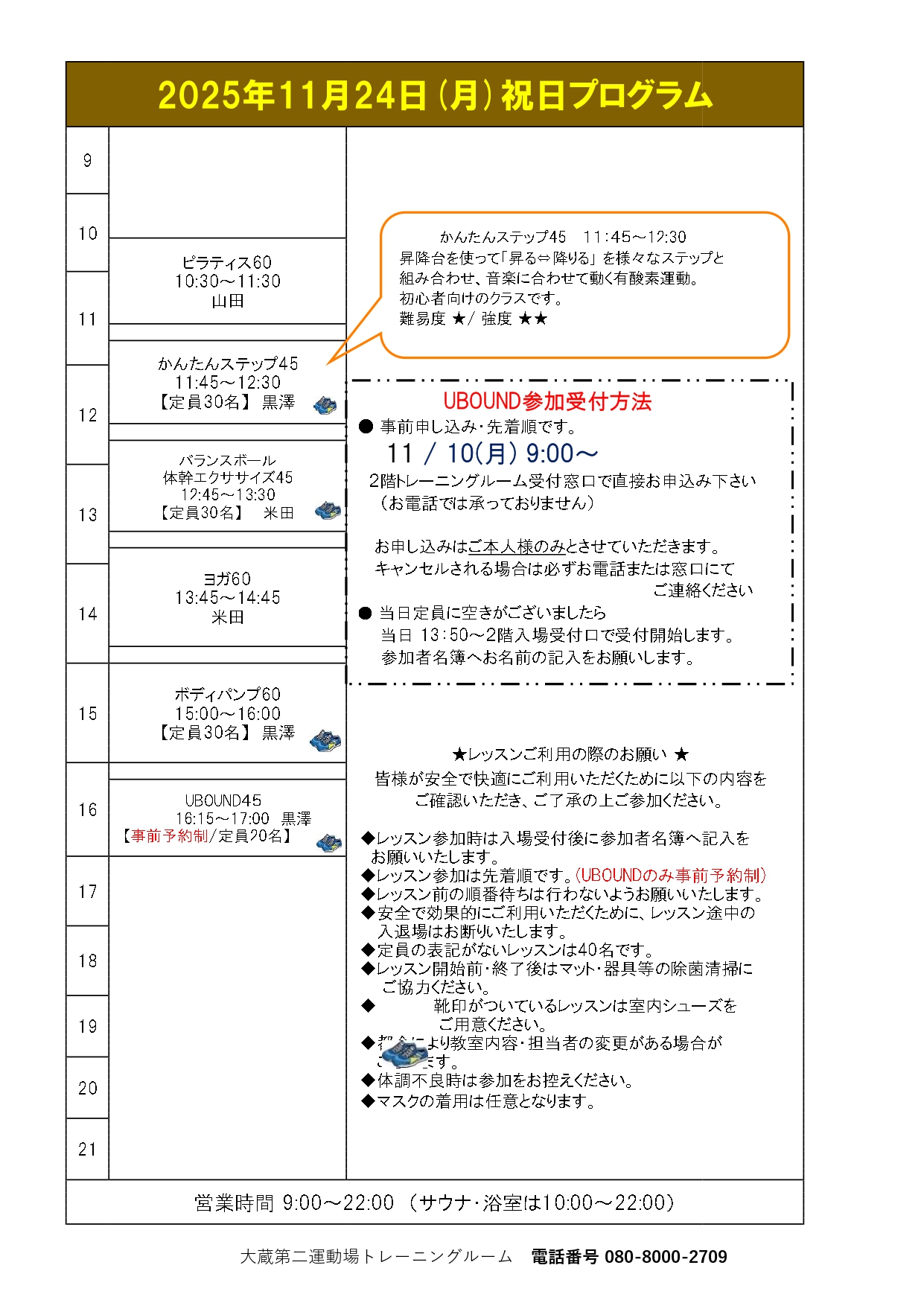 大蔵第二運動場 フィットネス「祝日プログラム」開催のお知らせ(11月24日)