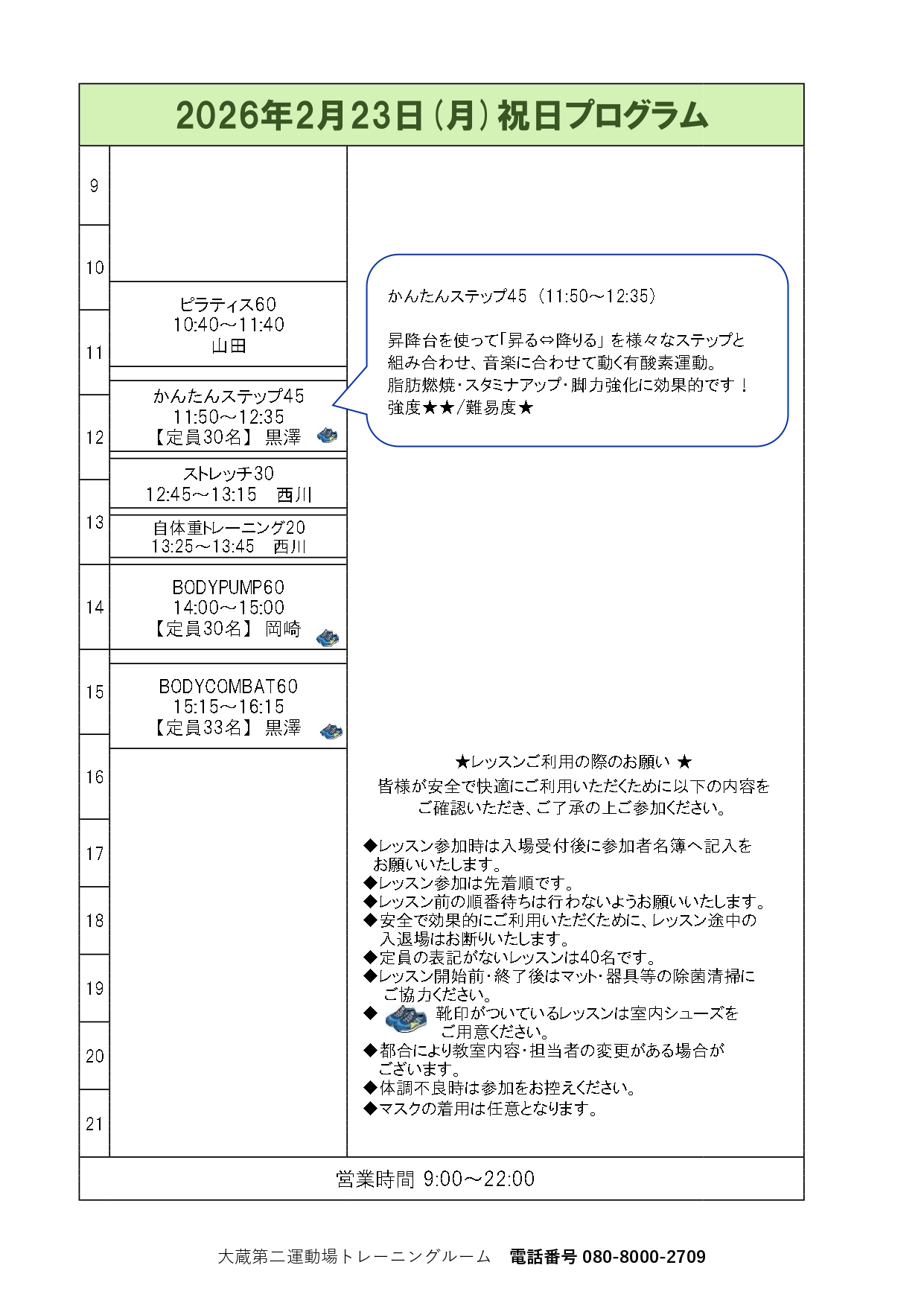 大蔵第二運動場 フィットネス「祝日プログラム」開催のお知らせ(2月23日)